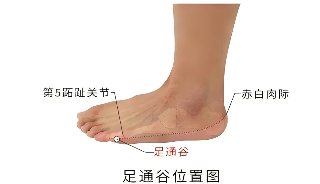 The Ashitsugu acupoint is a pair of acupuncture points located on the outside of the little toe on the foot, just above the red and white flesh, and is very easy to find.