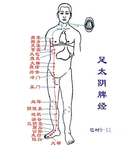 Main line: from the end of the big toe, from the inside of the toe to the anterior side of the medial malleolus, along the back of the tibia, in front of the ground machine and intersect with the liver meridian, walk on the knee and thigh, enter the abdomen, enter the spleen and branch into the stomach, the upper diaphragm, pass through the pharynx, and distribute under the tongue;