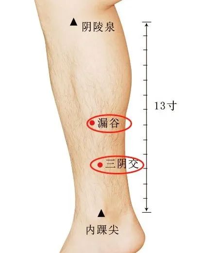 From the Sanyin intersection acupoint to the lower edge of the inner side of the foot bone up 3 inches, it is the leaky valley acupoint.