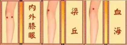 ▲ The inner and outer knees (the two eyes below the knee fossa), the sea of blood (the inner side of the two fingers above the knee), and the beam mound (the outer two fingers above the knee) are pressed hard, which is very effective for patellar malacia.
