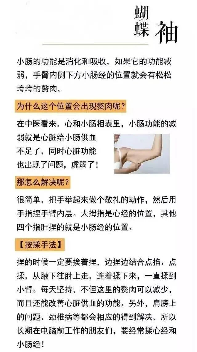 1. Upper arm: Lift your arm to see if there are hanging muscles on the inside of the entire upper arm? This is the "butterfly sleeve" that many female friends hate. Many middle-aged and elderly people have this piece of meat under their upper arms that is very loose and soft, and can even be thrown around ......