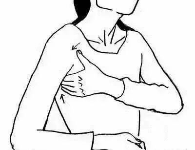 Stretch out your left arm, use your right thumb into your left armpit, and vigorously pluck the Jiquan point at the apex of your armpit.